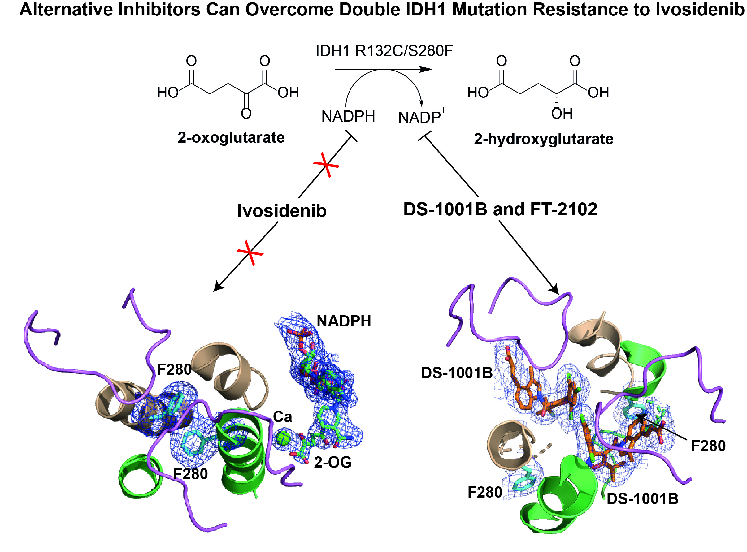 Mutated IDH1 contributes to the disease development of AML by producing 2-hydroxyglutarate (2-HG). The IDH1 inhibitor ivosidenib binds to the mutated enzyme and suppresses 2-HG production by a process known as allosteric control, whereby a molecule affects the function of a protein by binding to it away from the active site. This suppression of 2-HG production induces clinical responses in relapsed and refractory IDH1-mutant AML. Unfortunately, some patients with AML have become resistant to ivosidenib because of an acquired second genetic mutation in IDH1.